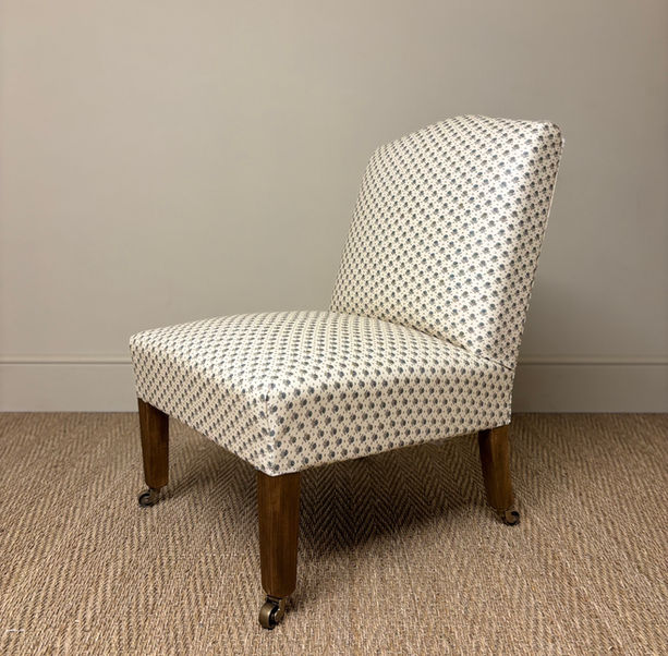 The Winsford Slipper Chair. A solid beech frame traditionally upholstered with a hand lashed coil sprung deep seat and stitch and stuffed back hand crafted using natural coir and hair, with hand sewn rolled edges. Raised on beech tapered legs and optional castors.